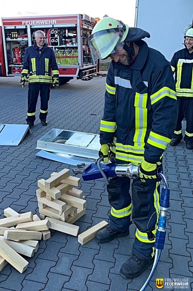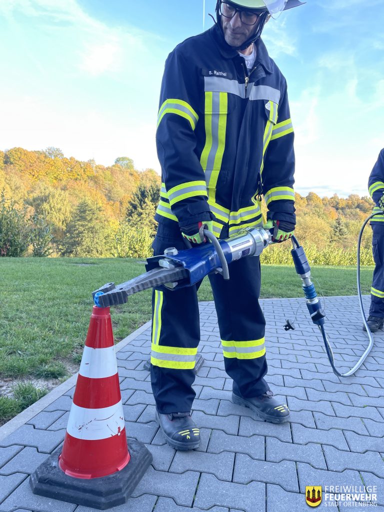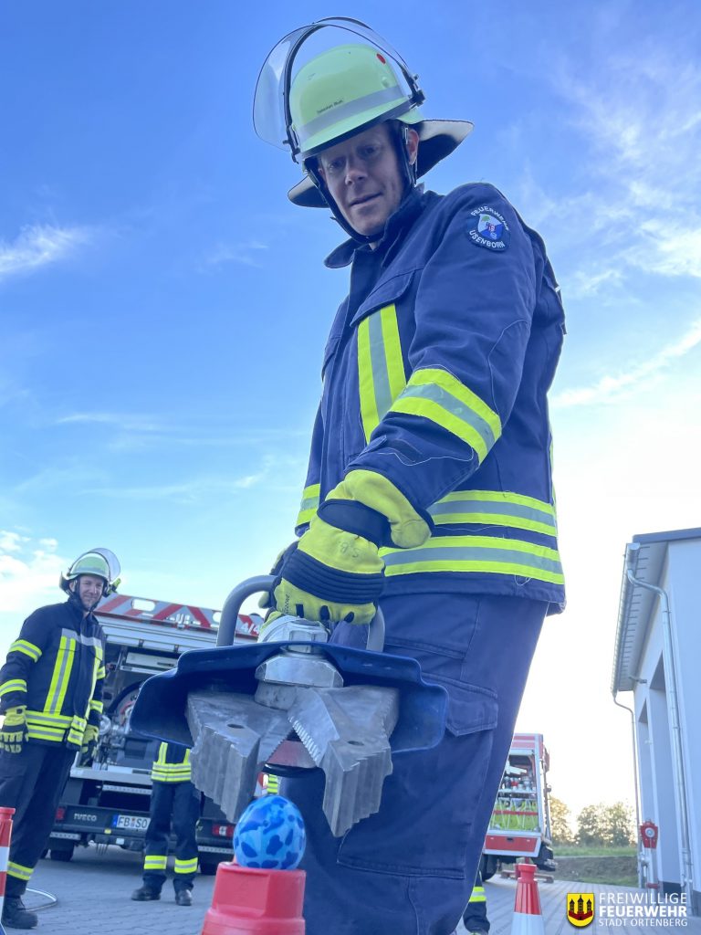 Für Abwechslung sorgte der Übungsabschnitt mit dem hydraulischen Kombigerät – Schere und Spreizer. Hier standen Geschicklichkeit und Feingefühl im Vordergrund: Mit dem Spreizer mussten Eier von einem Verkehrsleitkegel auf den nächsten transportiert werden, ohne sie zu beschädigen. Und auch das beliebte Spiel „Jenga“ wurde in überdimensionierter Form zum Trainingsobjekt, wobei die großen Holzklötze mit dem hydraulischen Gerät bewegt werden mussten – eine spielerische, aber äußerst effektive Methode, um die präzise Bedienung der Rettungsgeräte zu trainieren.