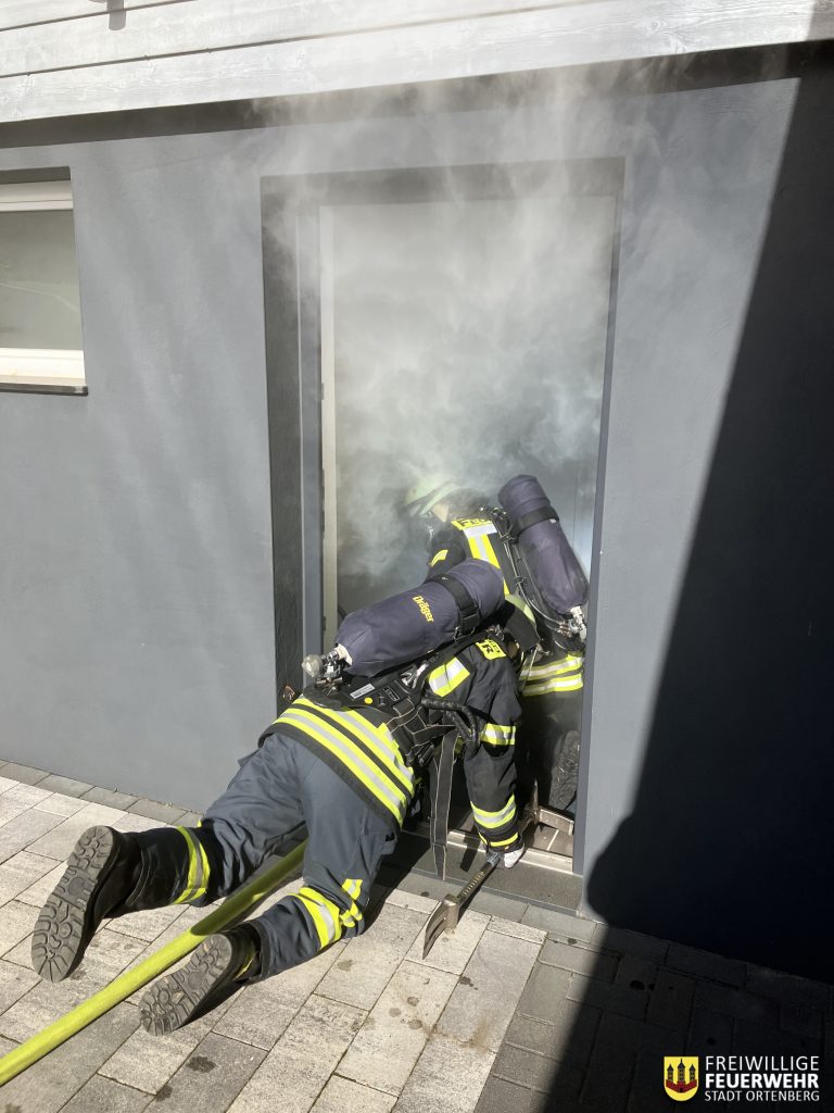 Ein Schwerpunkt lag auf einem Brandeinsatz mit Löschangriff im Innenraum einer Garage. Hier wurde das sichere Vorgehen im Innenangriff trainiert – von der richtigen Schlauchführung über die Kommunikation im Trupp bis hin zur gezielten Brandbekämpfung unter realitätsnahen Bedingungen.