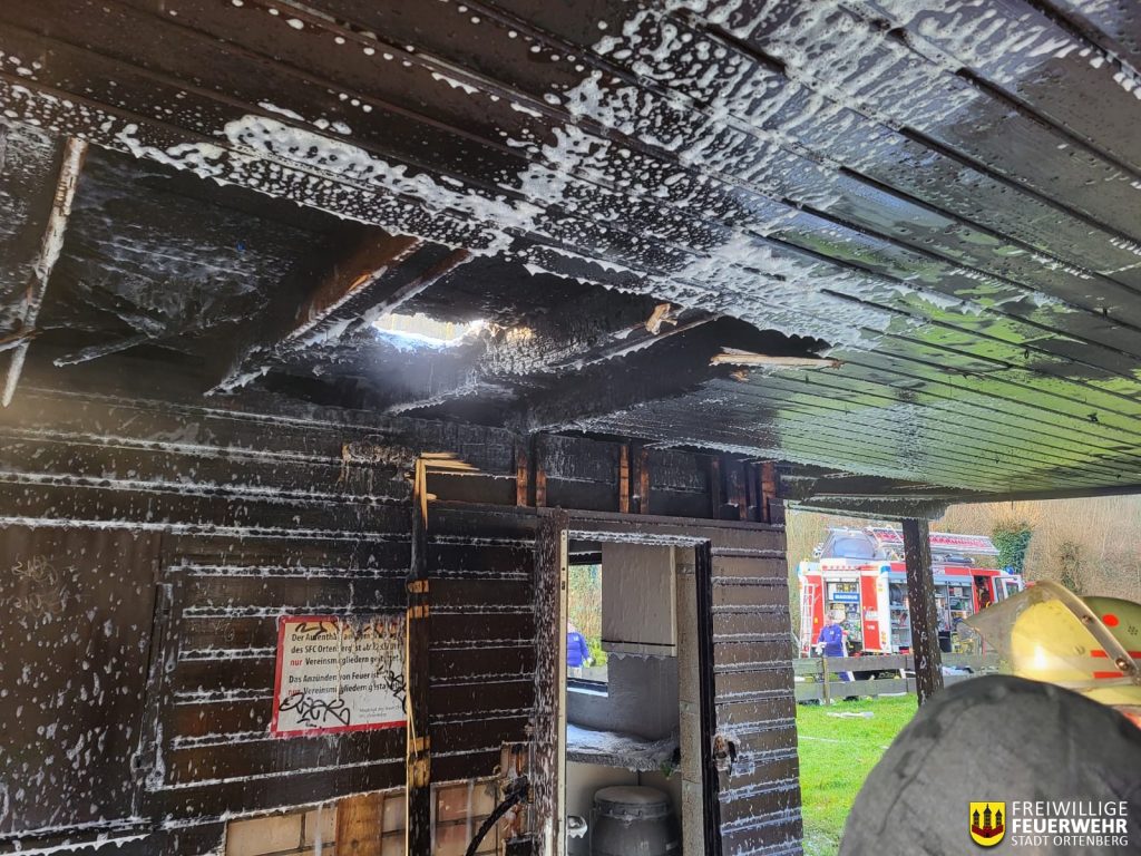 Bei der Erkundung stellte der ersteintreffende Fahrzeugführer fest, dass aus dem Inneren der Gartenhütte Rauch drang und im Außenbereich Flammen zu sehen waren.