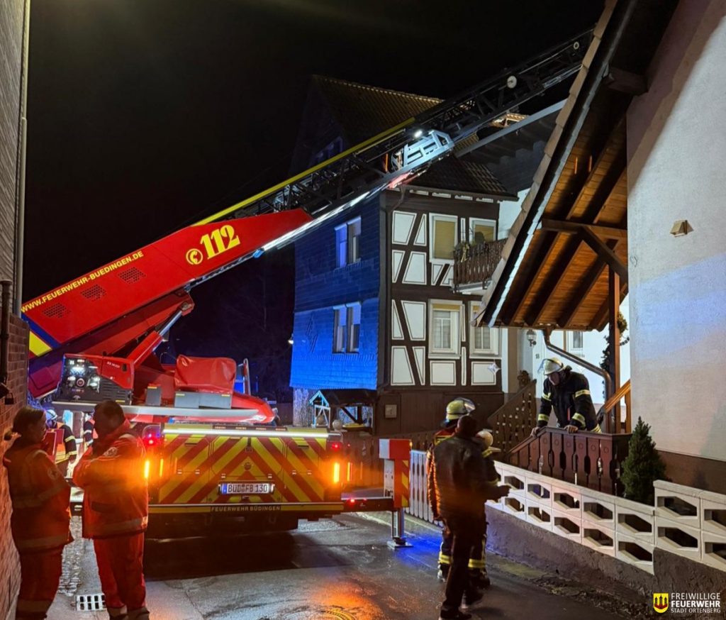 Beim Eintreffen der ersten Kräfte begann die Feuerwehr umgehend mit der Entrauchung der Wohnung. Parallel wurde eine Erkundung durchgeführt. Der hinzugezogene Schornsteinfeger kontrollierte mittels der Drehleiter der Kameraden aus Büdingen die Schornsteinzüge vom Dach aus.