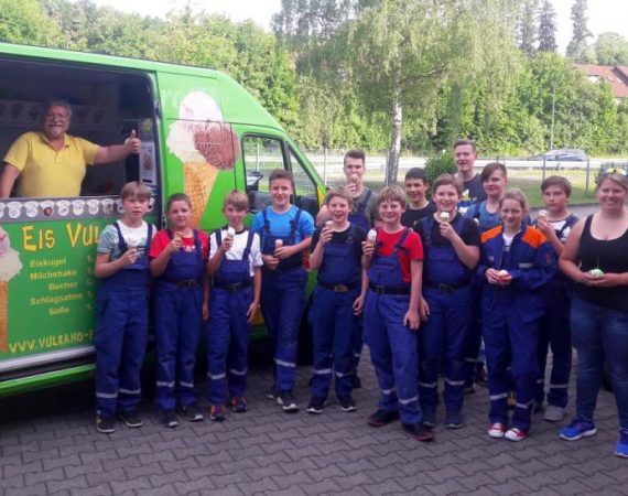 Inmitten der Vorbereitung für die Jugendfeuerwehrwettbewerbe stand eine Überraschung für die Jugendfeuerwehr Ortenberg-Mitte auf dem Hof. Zu Gast war Coco Valenti vom Eiscafe Vulkano aus Hirzenhain, er hatte sich gedacht den Jugendlichen eine Freude mit einer schönen Abkühlung zu machen. Eien richtige Schlange bildete sich vor seinem Eiswagen, als Erinnerung...