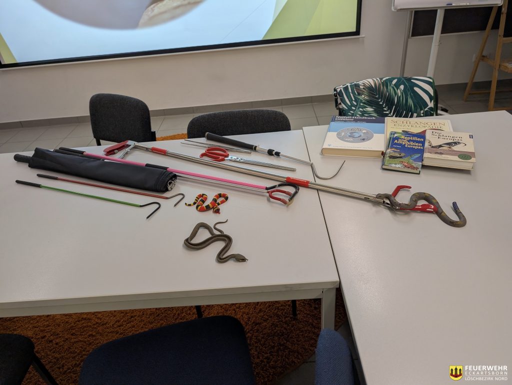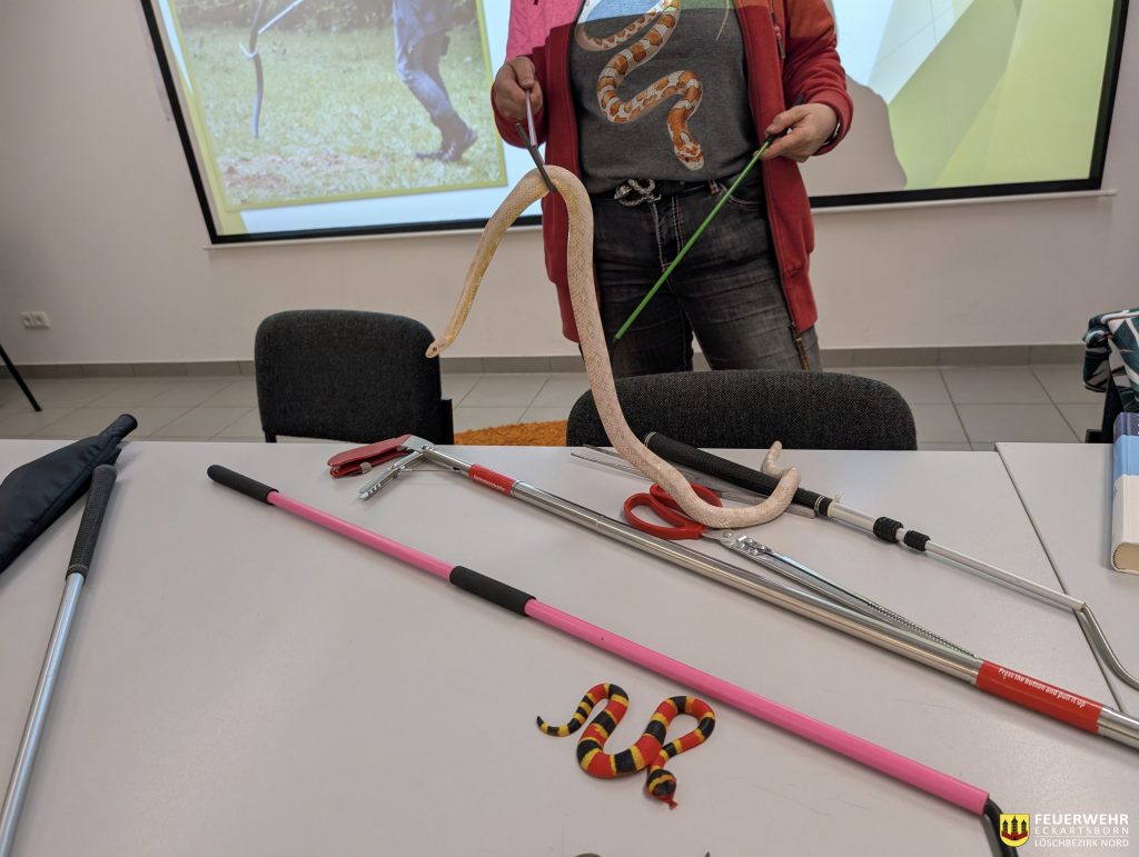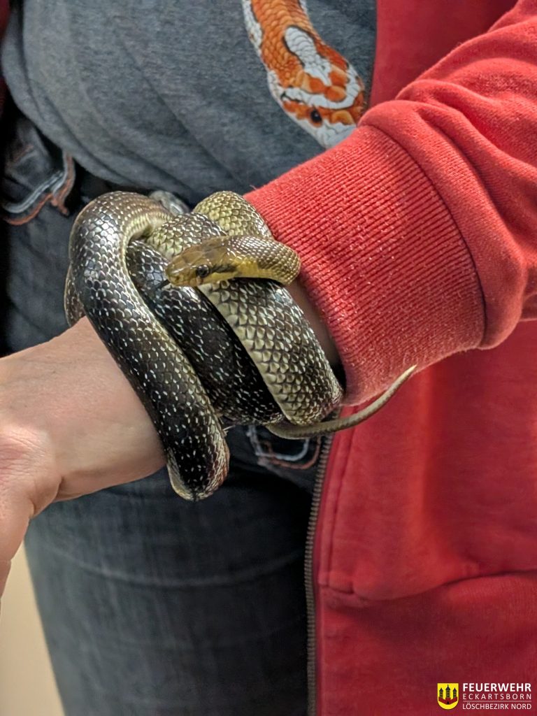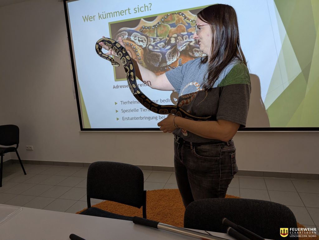 Für Begeisterung – und ein wenig Ehrfurcht – sorgte der praktische Teil der Übung. Frau Klier-Heil hatte mehrere lebende Schlangen verschiedener Arten und auch eine Vogelspinne mitgebracht. Die Einsatzkräfte konnten diese nicht nur aus nächster Nähe sehen, sondern auch deren Verhalten unmittelbar beobachten. Dies vermittelte ein realistisches Bild potenzieller Einsatzsituationen, das keine theoretische Schulung ersetzen kann.