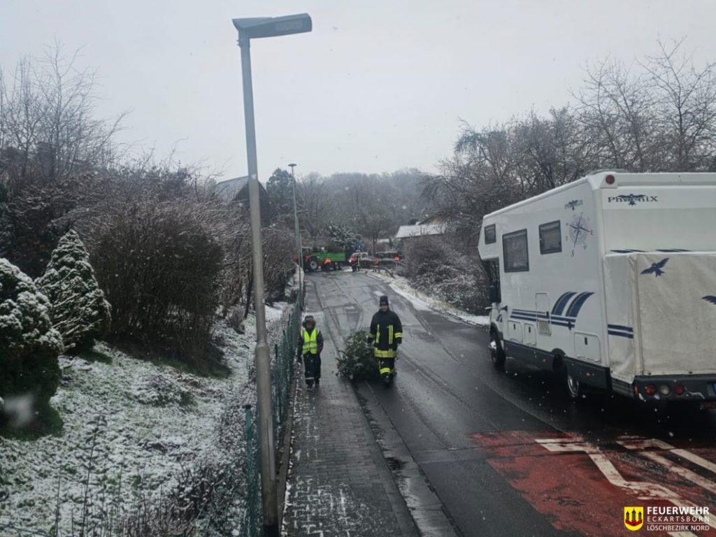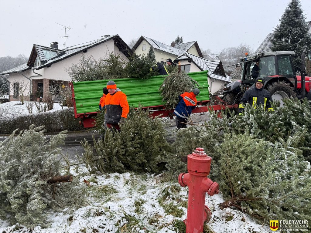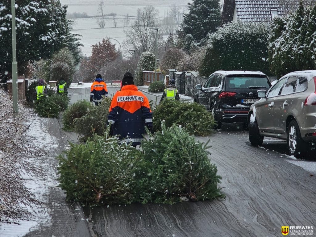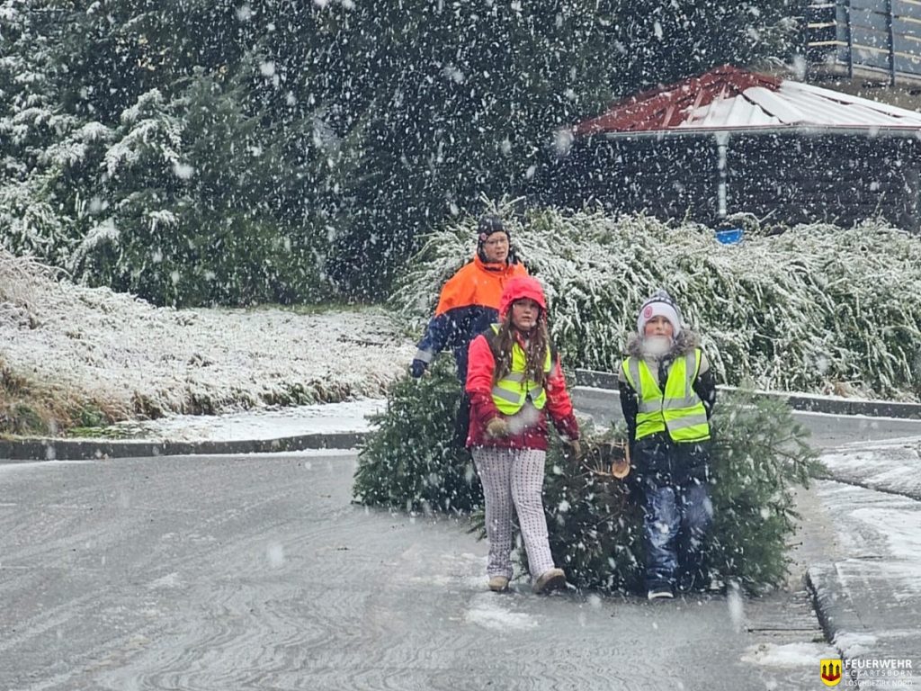Bei winterlichen Bedingungen machten sich Kinder, Jugendliche und aktive Feuerwehrkameradinnen und -kameraden gemeinsam auf den Weg, um die ausgedienten Weihnachtsbäume im Ort einzusammeln. Während der Sammelaktion setzte Schneefall ein, wodurch die Straßen und Wege stellenweise sehr rutschig waren. Trotz dieser erschwerten Bedingungen arbeiteten alle engagiert und mit viel Teamgeist zusammen.